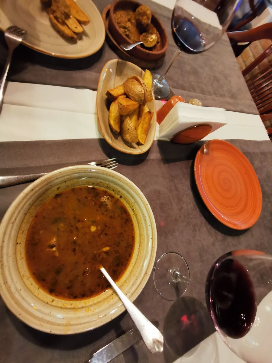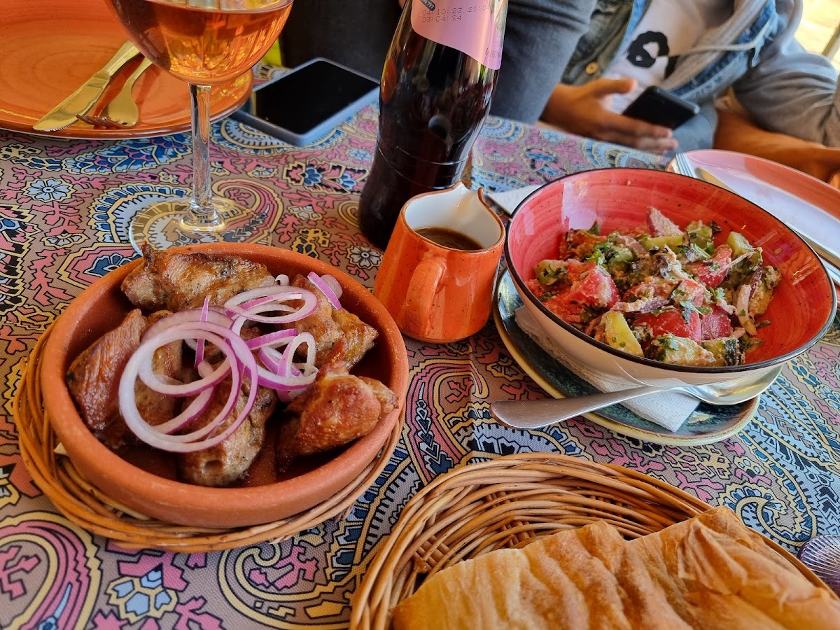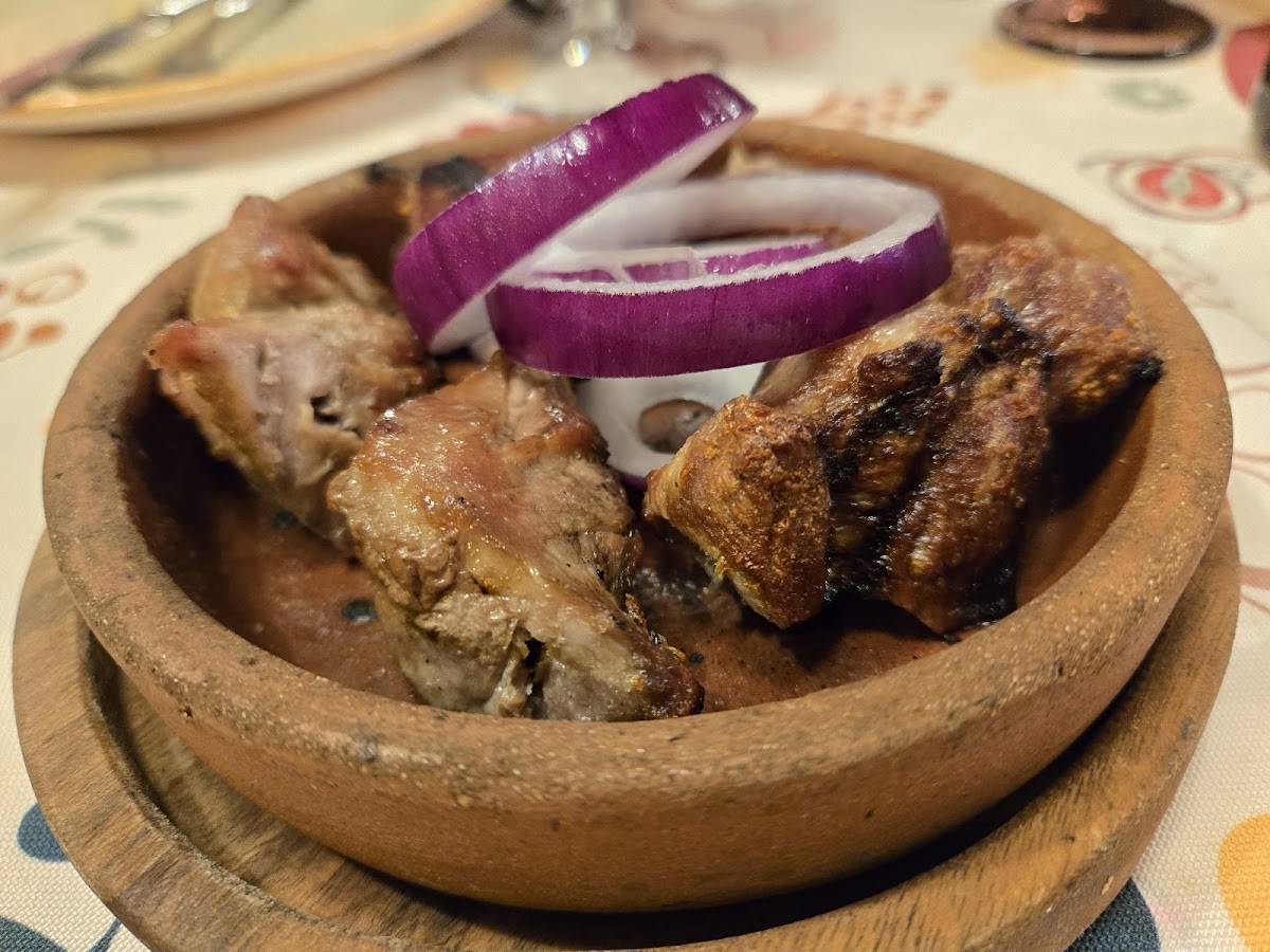 We stopped in after speaking to the gentleman outside (he was very nice and not pushy). Atmosphere was very nice. Anywhere we go, we try local dishes and it did not disappoint. Kinkali, chicken in white sauce, lobio, and suggested wine were all excellent. Service was very good. One thing to keep in mind while here; service is a little different. Sometimes you need to politely raise your hand/get the servers attention to order/assistance. That goes for almost everywhere. It's not bad.....just different.